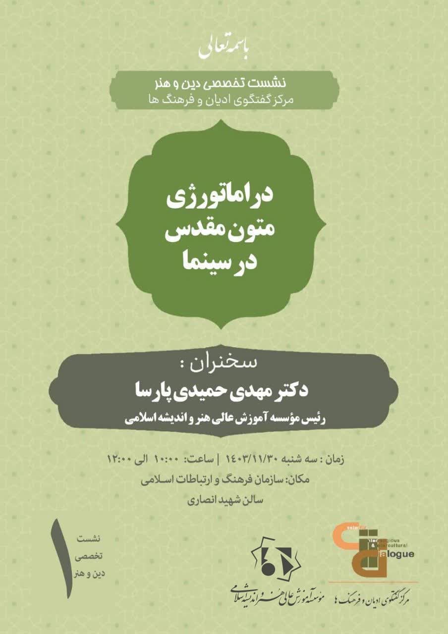 مؤسسه آموزش عالی هنر و اندیشه اسلامی با همکاری سازمان فرهنگ و ارتباطات اسلامی، در راستای اهداف خود مبنی بر توسعه و ترویج اندیشه های دینی در حوزه هنر، مجموعه نشست های تخصصی «دین و هنر» را برگزار می کند: