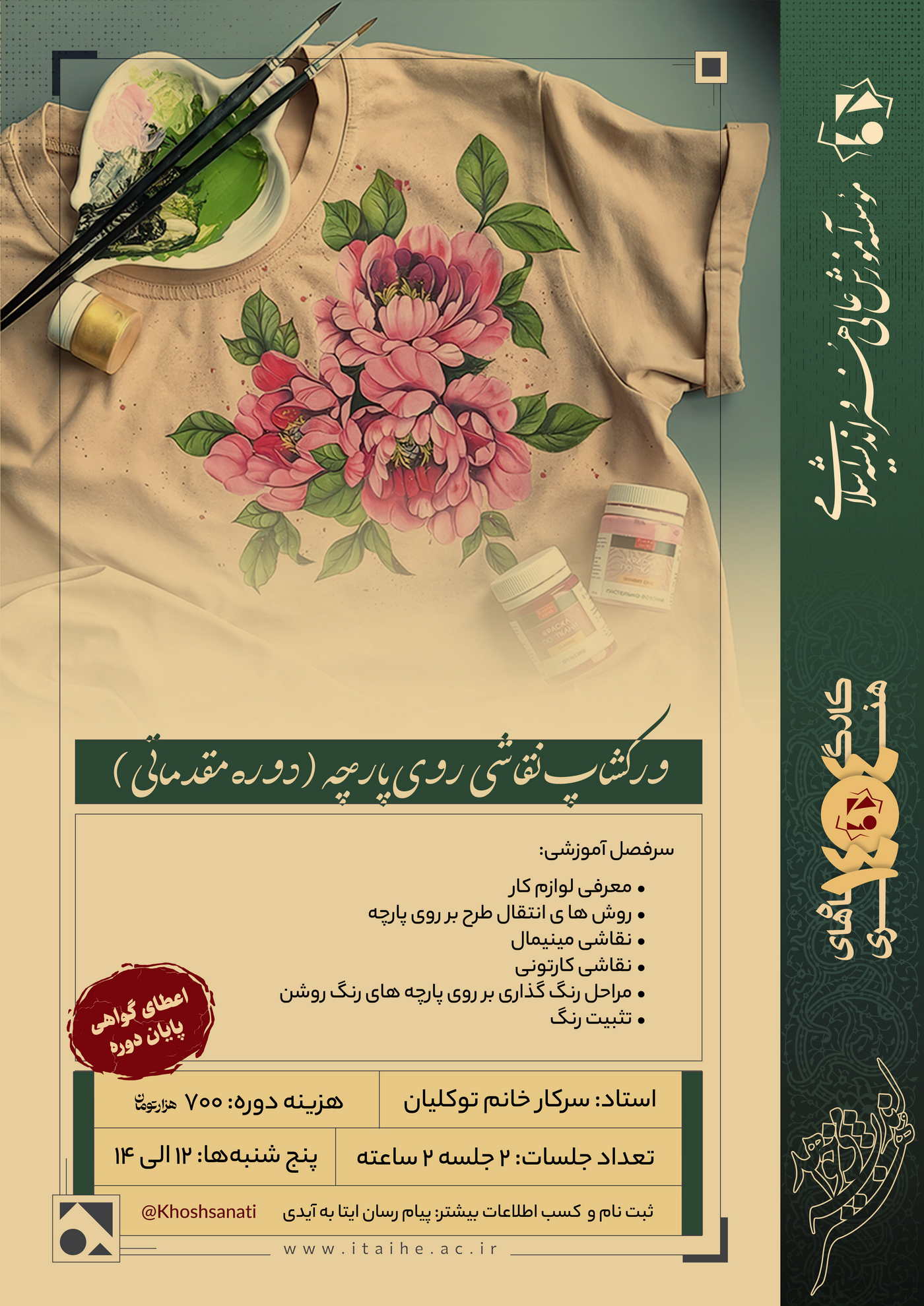 اگر به هنر نقاشی علاقهمندید و دوست دارید مهارتی متفاوت و کاربردی بیاموزید، ورکشاپ «نقاشی روی پارچه (مقدماتی)» فرصتی عالی برای شروع است. در این دورهی جذاب، با ابزارهای تخصصی این هنر آشنا میشوید، روشهای انتقال طرح روی پارچه را میآموزید و با تکنیکهای نقاشی مینیمال و کارتونی بر سطح پارچههای روشن کار میکنید. مراحل رنگگذاری و تثبیت رنگ نیز بهصورت عملی آموزش داده میشود تا بتوانید آثار خلاقانه و ماندگاری خلق کنید. این ورکشاپ برای همه علاقهمندان—حتی بدون پیشزمینه هنری—مناسب است